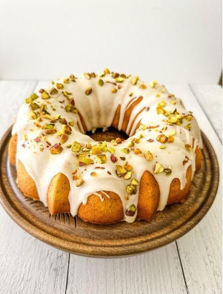 - To make the icing, whisk together powdered sugar and 2 tablespoons milk. If the mixture is too thick, add in an additional tablespoon. Pour over cake and top with a sprinkling of chopped pistachios.