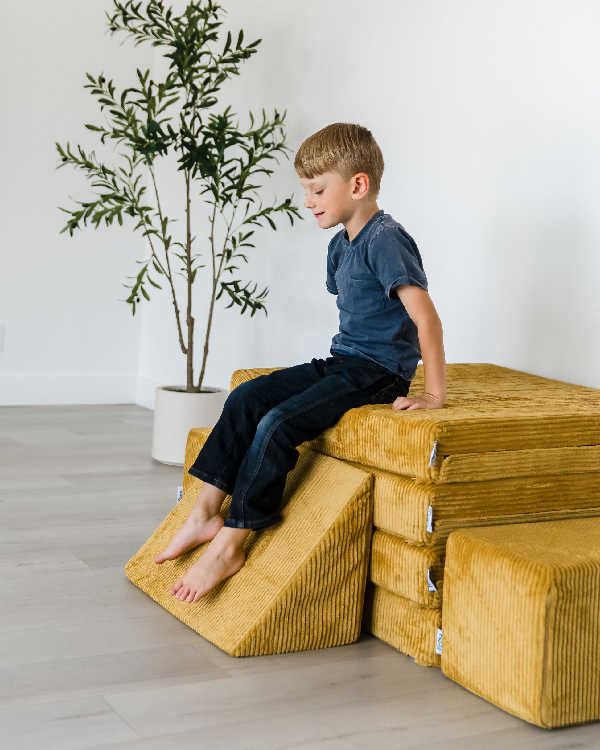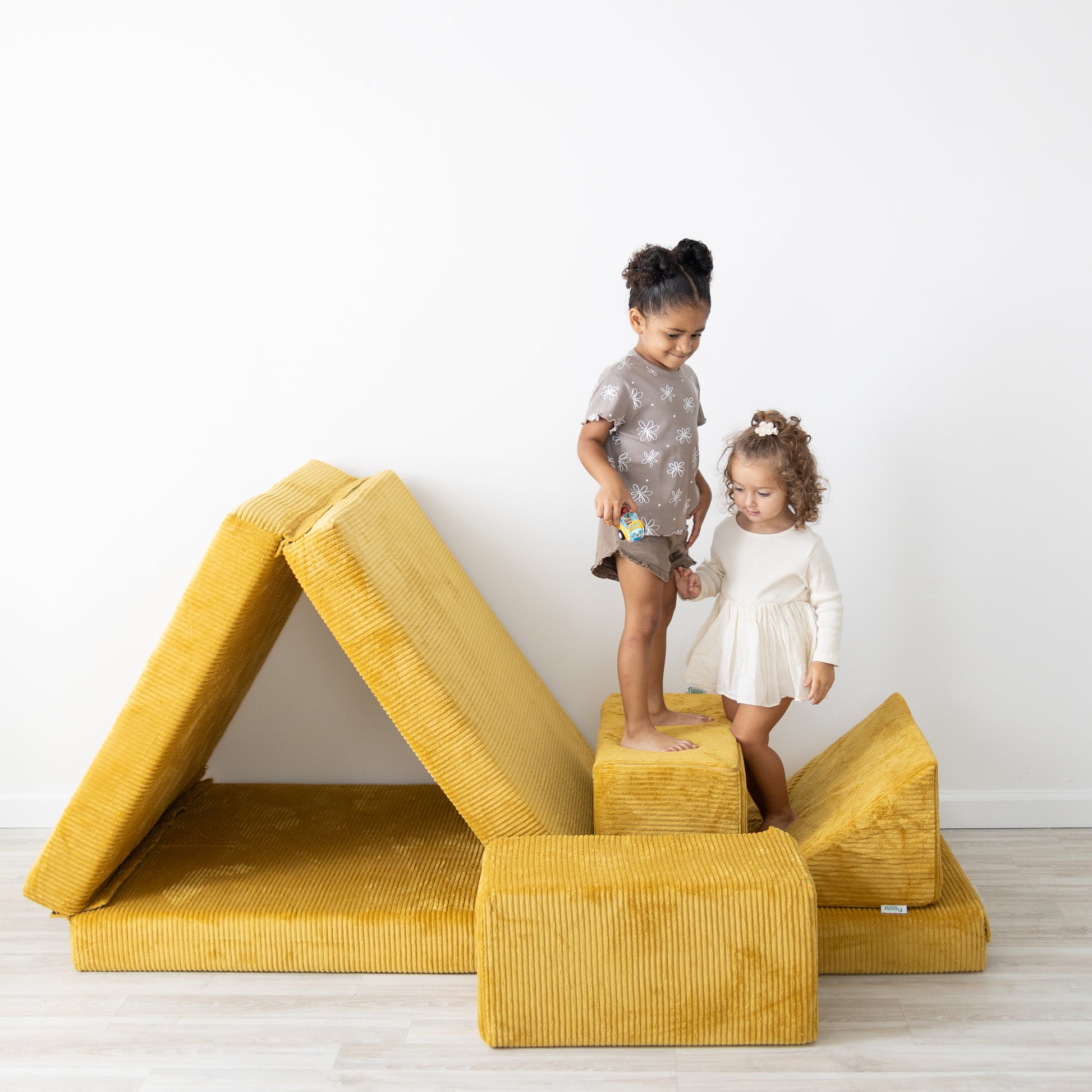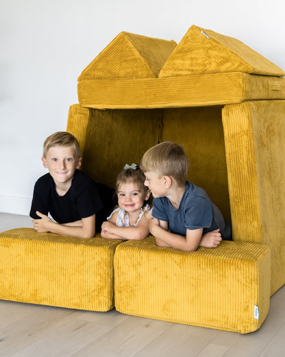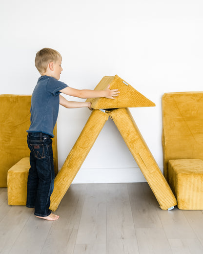 The Figgy is easy to stack, build on and climb, and occupies a small footprint when disassembled. With the widest cushion being 33”, it seamlessly blends into the decor, even when stacked in a corner during non-play times.