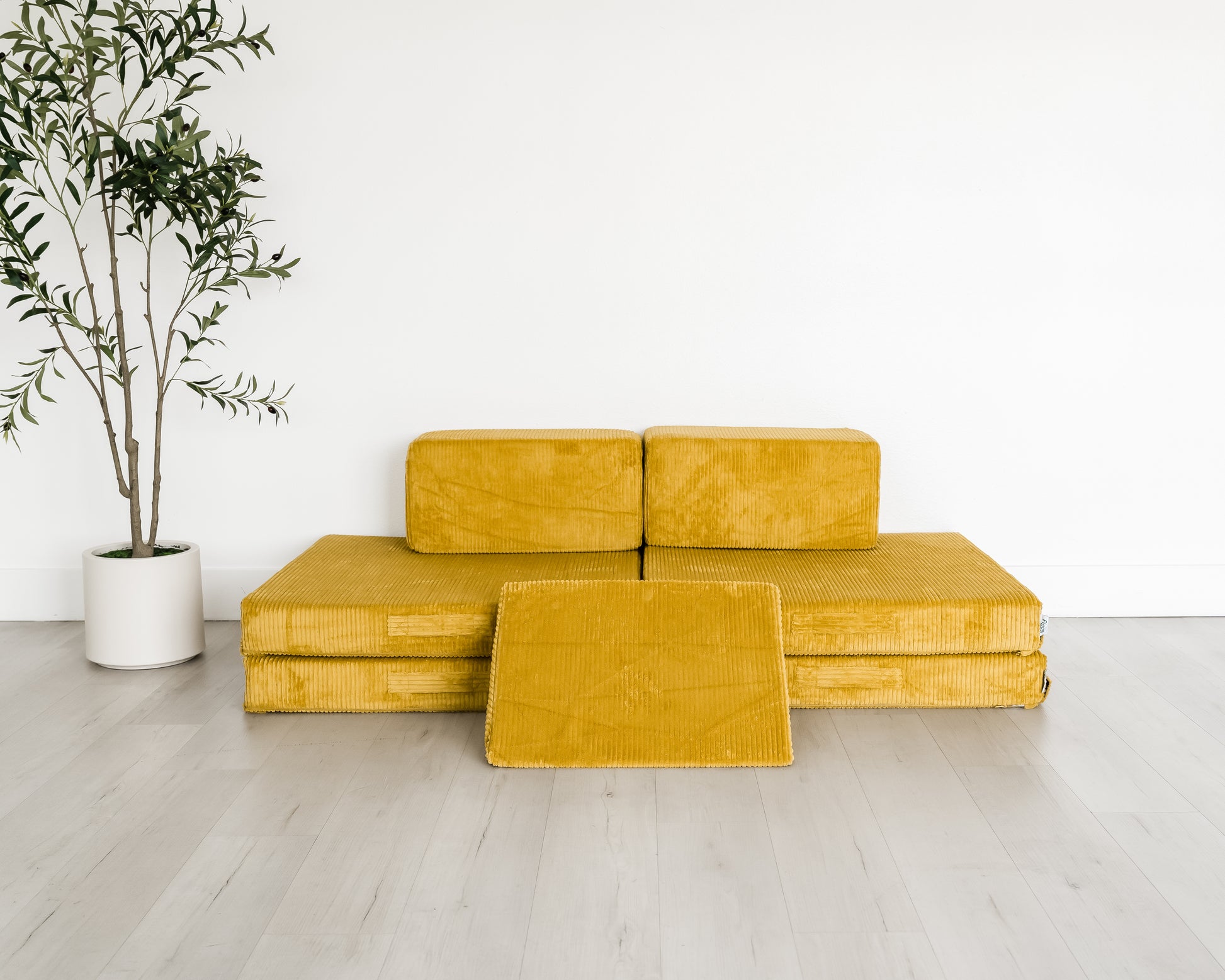 Unlike other play couches that pre-connect the base pieces the Figgy features four individual foundation cushions that can be used separately or secured together with our super strong, patent-pending Velcro® connectors.